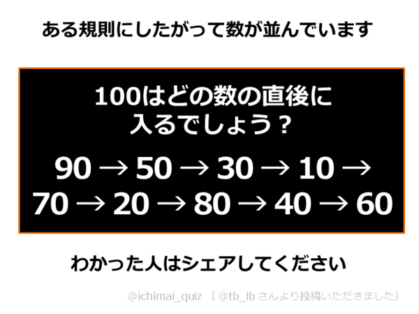 【 #1枚クイズ051 】100はどの数の直後に入るでしょう?答えがわかった人はRTで( @tb_lb さんより投稿いただきました)