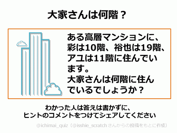 【 #1枚クイズ080】大家さんは何階に住んでいるでしょうか?(@isshie_scratch さんからの投稿をもとに作成しました)