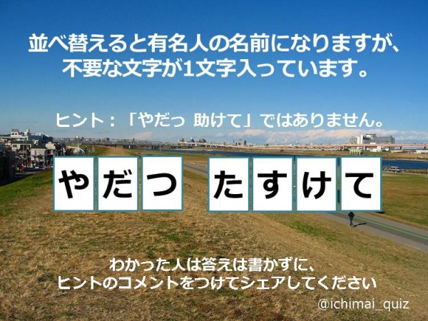 並べ替えると有名人の名前になりますが、不要な一文字が入っています。